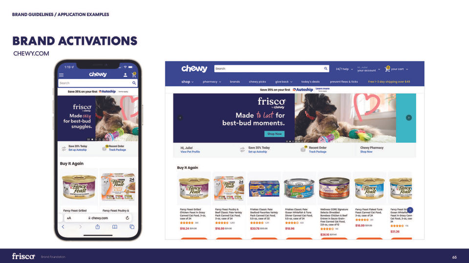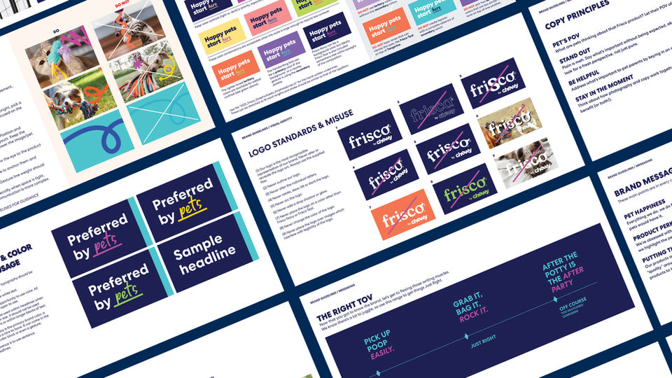 In 2023, our team was tasked to create a new and improved set of brand guidelines that outlined a refreshed look, feel & tone for one of Chewy's favorite sub brands. The brand direction really honed in on the "big joy" received in those "little moments" with your pet. We wanted to keep that Frisco fun look and feel, but dialing it back just a little to really let Frisco's large selection of top products shine.